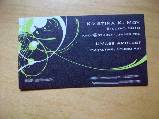 Not the best, but it gets the point across. People can tell I’m a creative person with my expertise in marketing and studio art. It gives my basic contact info if they’d like talk to me. Sure, you’ll be handing out resumes, but giving them your business card with your resume will leave a good impression on them. Fact: most employers don’t expect students to have business cards at all. Having a business card means you’re a person who wants to network with others. What’s the solution? You can always go to VistaPrint.com for a pack of free 250 business cards. They have many templates to choose from, or you can customize your own. A few clicks of the mouse and BAM! You’ve got business cards so you can tell people why you’re a good candidate for a company or organization.