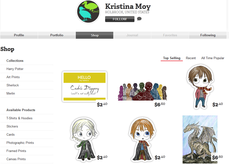 Etsy has a lot of my crafty items that I hand-make myself, from custom notebooks, Hogwarts letters, magnet sets and select prints and stickers. All Etsy orders are personally handled by me, from invoicing all the way to shipping.